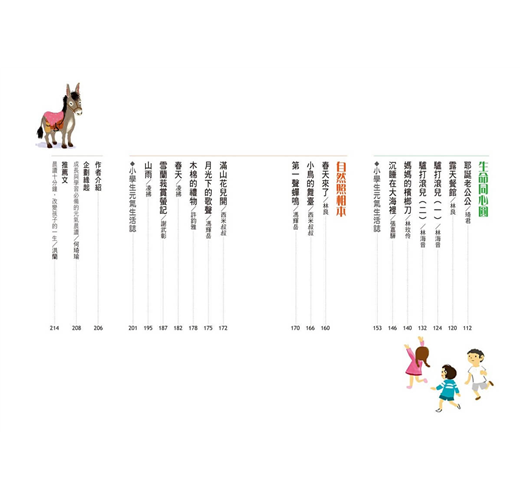 2.第一本以兒童生活中的「人、事、物、自然」為架構的散文選,精選28篇臺灣兒童散文界名家作品,從四大主題引領孩子入門生活散文。