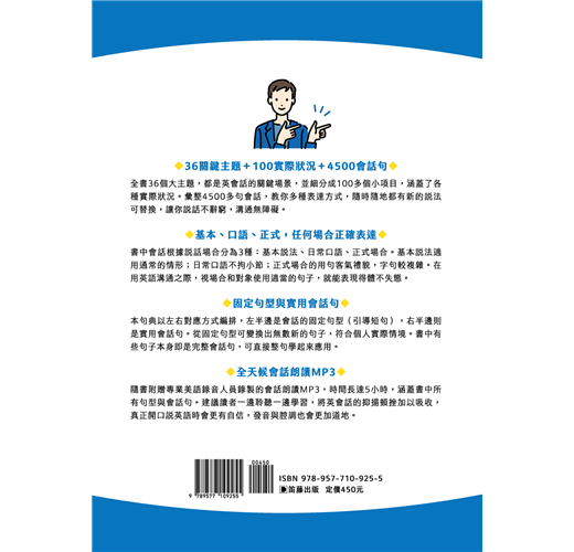 全書36個情境主題,並細分成100多個實際狀況,共彙整4500多句會話例句,教你多種表達方式,讓你說話不辭窮,溝通無障礙!