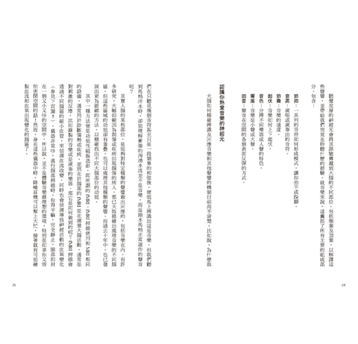 本書涉及兩個少了彼此就無法存在的世界相撞:人腦的世界以及大腦創造、演奏、享受的音樂世界。這是個有關神經細胞和迴路的故事,這些東西讓從「菲董」菲瑞.威廉斯(Pharrell Williams)到蘇聯作曲家普羅高菲夫(Sergei Prokofiev)的音樂家可以創作並演奏他們的音樂作品;這同時也是每一位音樂學生和老師的故事,老師試圖讓學生在演奏樂器或歌唱時臻至完美;這還是當你聽到巴西傳奇歌手艾莉絲.芮吉娜(Elis Regina)或非裔美國作曲家史考特.喬普林(Scott Joplin)的歌曲時,會讓你的身體不由自主隨著節拍舞動的故事;或是當你...