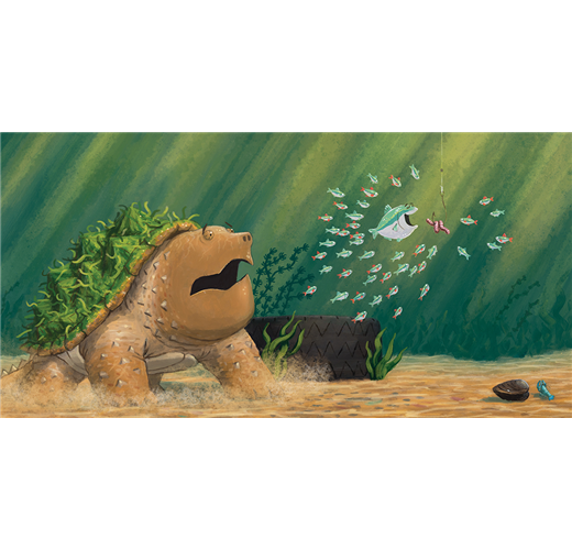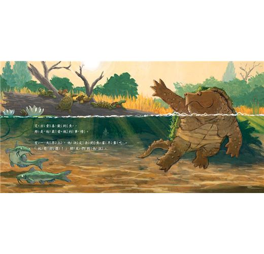 逆轉的生態食物鏈?誰才是真正的英雄?釣魚的樂趣是等待?是過程?還是獵物上鉤的瞬間?這是一個關於「釣魚」的故事,在故事裡面,大鱷龜扮演的狩獵者,一開始打算用舌頭當蟲餌飽餐一頓,沒想到……反轉再反轉的情節發展,充滿驚險,讓人無法停止地想看下去!