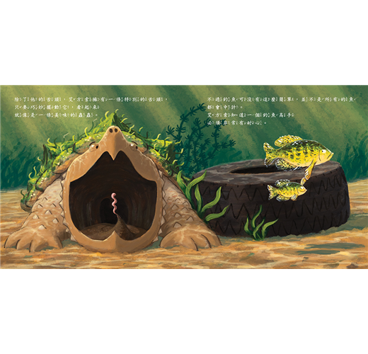 故事巧妙融合大鱷龜(易危物種)的習性和食性,營造精彩情節,並在書末附上介紹和插圖,是一本融合環境教育、趣味生動的繪本,帶領孩子認識大鱷龜和淡水生態。