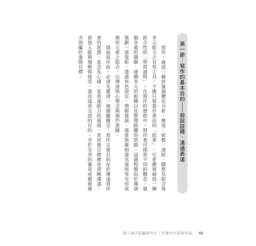 寫作不是天才論,而是有方法可論,有步驟可學,透過觀看他者以照見自我的書寫,逐步從覺知、辨析、認識、建構而後內化,這是書寫的歷程,也是認知的歷程;滌清多元發散的思維,才具聚焦與收束成為可視的文字。
