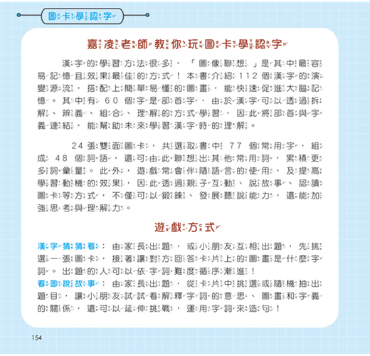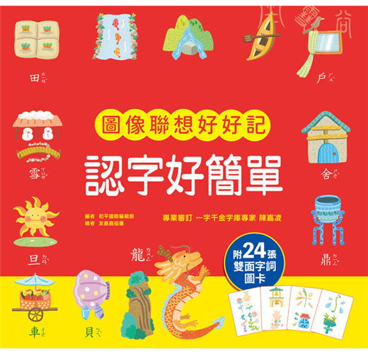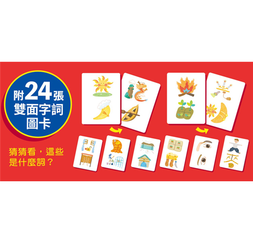 隨書另附24張精美雙面彩色圖卡,圖卡上共有由書中的字形想像圖組合而成的48個詞語,加上陳嘉凌老師的專業導讀以及遊戲方式說明,讓孩子能一起以圖猜字,練習連結字義與圖中的事物,也能親子共同遊戲,提升學習樂趣,寓教於樂!