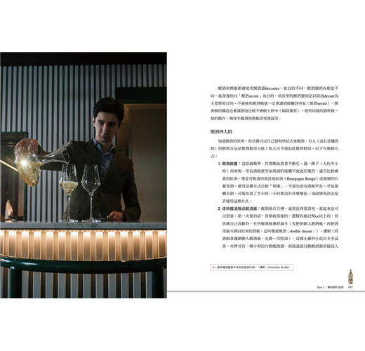 葡萄酒的儀式是長時間經驗歸結的法則,去蕪存菁,用最簡潔的方式讓你得到最多品酒的樂趣,也讓你有「安全感」:我看到該看到的顏色了、聞到書裡說的香氣了、喝到特定的味道了。於是你真的可以放鬆地馳騁思緒與酒杯之間,打開靈魂的另一個時空。現代或本書所說葡萄酒的「儀式感」,或應該說是「良好的處理方式」,會將你與葡萄酒及天地人的紐帶串起。酒汁風味與你的「人」與「心」有確實的勾連,帶出你情感的表達,獲得獨一的享受。熟練的葡萄酒儀式讓你可以更加專注於當下,漂亮的動作絕不是表面的「裝」而已。
