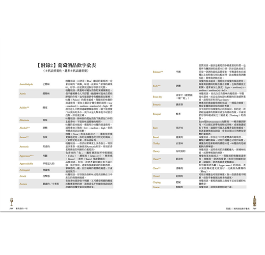 ◆書末並附有葡萄酒小事典和品飲字彙表,方便讀者查索參考。