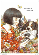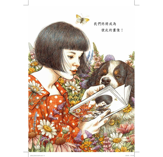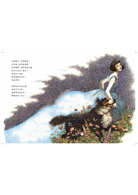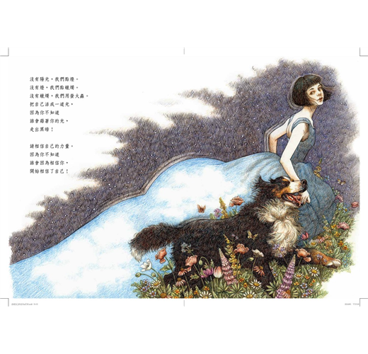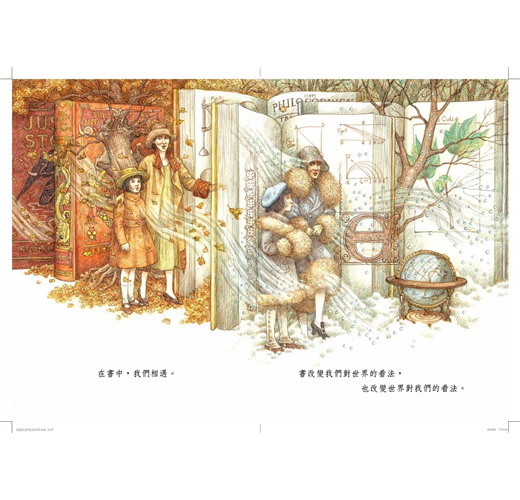 ❃繪者尹芳吉伯和丹尼納諾在創作這則故事時,為了增添如夢似幻的氛圍,費盡巧思設計,加入許多魔幻寫實的元素和童話相關元素等。像是在書的迷宮中,可以看到每一本書都是經典故事,裡頭的文字化作翩翩起舞的蝴蝶,令人心蕩神馳。在旅途中,也能發現不少向經典故事或人物致敬的插畫,像是海面下巨大的鯨魚,正是出自於《白鯨記》,畫中的雪原,靈感來自安徒生的《雪后》,而駕駛飛機的插畫,則是向知名女飛行員艾爾哈特(Amelia Earhart)致敬。在書的神秘國度,我們更可以看到許多童話人物從扉頁飛躍而出,個個活靈活現。當吳爾芙帶著女孩在國度遊歷時,繪者用不同季節開花的樹,象徵兩人走過歲月,當她們打開一扇扇書的大門時,還可以看到女孩隨之成長,衣著也不斷變化,呼應吳爾芙對服飾的看法。女孩體悟吳爾芙的生命智慧,活成一道天光時,她的衣服隨即化成天空的雲彩,照亮無盡的黑夜。最終,女孩離開國度,回到最初的起點,但她已然脫胎換骨,找到屬於自己生命的鑰匙,一本專屬她的書,她細細品味裡頭的文字,那些吳爾芙交給她的珍寶。此外,為了演繹這則成長故事,隨著故事進行,我們可以看到,女孩逐漸成為娉婷玉立的少女,陪伴她的小狗也慢慢變成穩重的大狗,本書的插圖不只呼應故事發展,更可在細節處發現繪者埋藏的精心巧思。