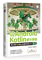 2017年Google官方指定Kotlin為開發Android應用程式的首選語言,其語法簡潔、直覺、開發效率高,因此掌握Kotlin程式語言成為重要的趨勢。本書是作者集結10年來教授Android課程的心得與精華,內容使用Android Studio與Kotlin程式語言進行開發,並精心設計24個章節,以深入淺出的方式及生活化的例子,帶領讀者從零開始、循序漸進地學習Android的基礎知識與運作原理,提供讀者最通盤性的認識,讓初學者也能輕鬆學會Android開發,並以實務的方式,培養紮實的實作能力,使讀者掌握Android開發的要領。