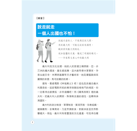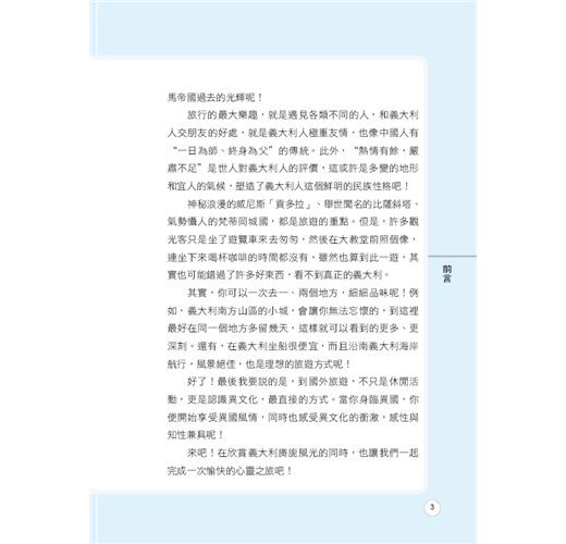 不僅如此,義大利還是文化古國、美食、流行之都,曾建立橫跨歐、亞、非三洲的龐大國度,產生過凱撒、巫大維等偉大軍事家,孕育出達芬奇、米開朗基羅等天才藝術家,她是羅蜜歐與茱麗葉的家園、馬可波羅的故鄉。