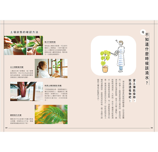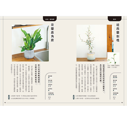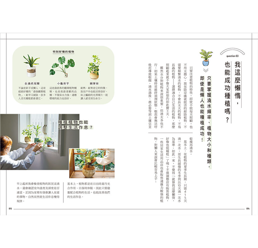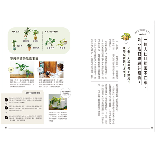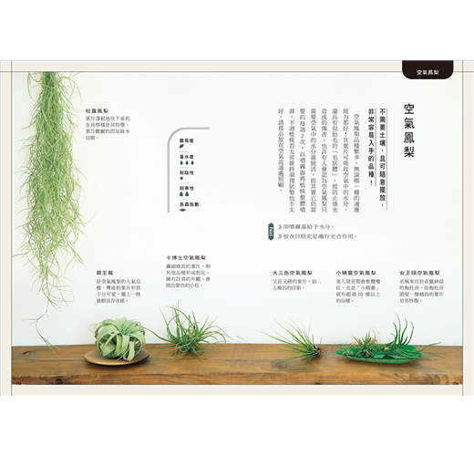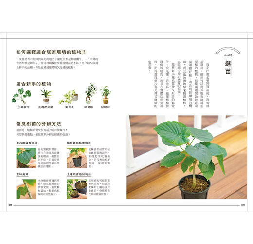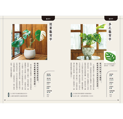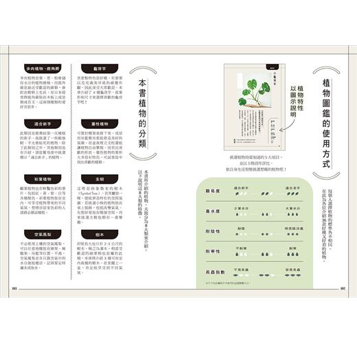 有著獨特裂孔葉片的龜背芋、用吊籃可以營造美麗垂枝的蔓性植物、有堅韌生命力的琴葉榕、耐陰又耐旱的鵝掌柴、葉子圓潤又飽水的椒草……書內用簡單明瞭的圖示,說明各植物的耐陰性、耐寒性、喜水度、種植難易度等特徵,讓你輕鬆掌握各類植物,把最想要的、最適合的都種起來。