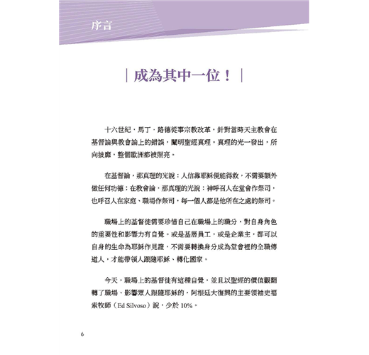 今天,職場上的基督徒有這種自覺,並且以聖經的價值觀翻轉了職場、影響眾人跟隨耶穌的,阿根廷大復興的主要領袖史福索牧師(Ed Silvoso)說,少於10%。
