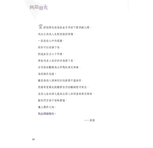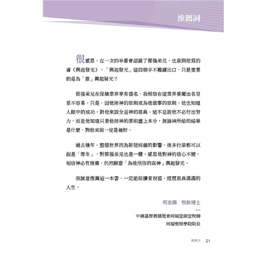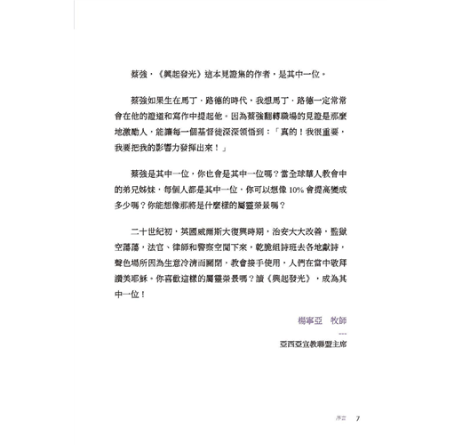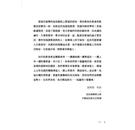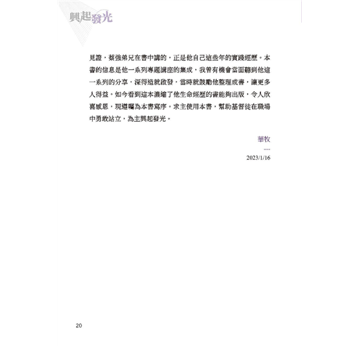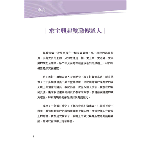 初代的教會都是雙職事奉,一邊織帳棚一邊傳福音,一邊工作一邊牧養教會。末日近了,如果我們要十億靈魂收割,要把福音傳到穆斯林的國家。我們需要許多像蔡強一樣愛神愛人、職場上又有見證的雙職傳道人。願上帝使用「興起發光」這本書,祝福台灣的眾教會,看重牧養職場的弟兄姊妹,使用他們成為雙職宣教士,在世界各地,為主興起發光,一起贏得十億靈魂。