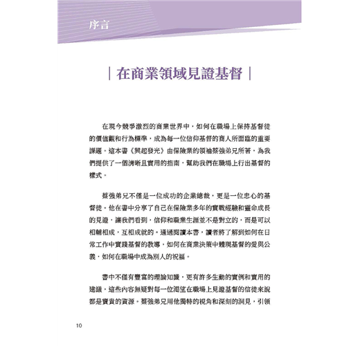 在現今競爭激烈的商業世界中,如何在職場上保持基督徒的價值觀和行為標準,成為每一位信仰基督的商人所面臨的重要課題。這本書《興起發光》由保險業的領袖蔡強弟兄所著,為我們提供了一個清晰且實用的指南,幫助我們在職場上行出基督的樣式。