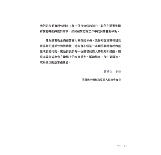 身為基督教全備福音商人團契的會長,我深知在商業領域見證基督的重要性和挑戰性。這本書不僅是一本關於職場倫理和靈性成長的指南,更是對我們每一位基督徒商人的鼓勵和提醒。願這本書能成為您在職場上的良師益友,幫助您在工作中榮耀神,成為真正的基督跟隨者。