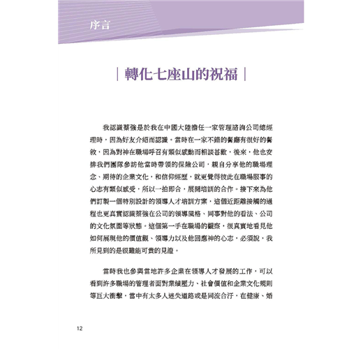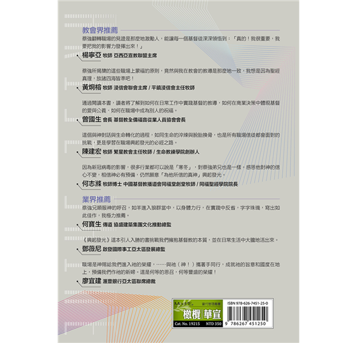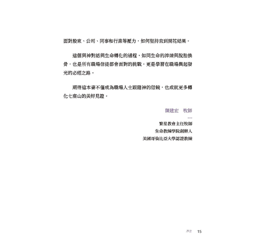 期待這本書不僅成為職場人士跟隨神的借鏡,也成就更多轉化七座山的美好見證。