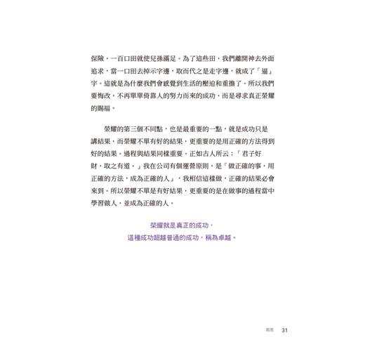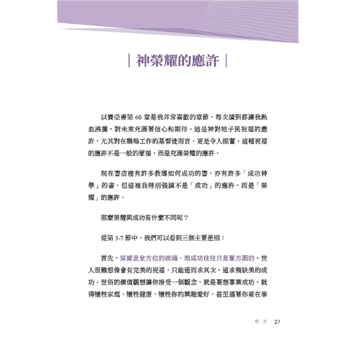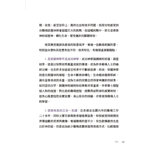 1.是榮耀神學不是成功神學:成功神學強調神的祝福,渴望結果。這是以短暫結果衡量成就的價值,成為許多職場人士的最終目標,也在許多信徒甚至牧者中不斷被追捧。然而,榮耀神學則是在跟隨神的過程,生命不斷被神轉化,生命越來越像耶穌,滿有基督長成的身量。因為生命的改變自然得著神應許的結果,如同亞伯拉罕。跟隨神的過程和結果都非常重要。作者舉七個聖經人物的經歷,對比他的職場歷程、挑戰與面對神的真實時刻,這些心路歷程的真實披露、高山低谷的經驗,非常值得職場人士的學習。