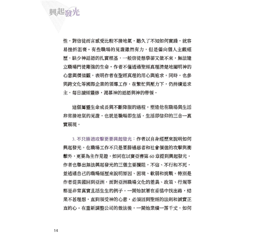 3.不只勝過攻擊更要興起發光:作者以自身經歷來說明如何興起發光。在職場工作不只是要勝過惡者和社會價值的攻擊與衝擊外,更要為主作見證,如同在以賽亞書第 60 章提到興起發光。作者也舉出無法興起發光的三個主要攔阻,不信、不行和不死,並透過自己的職場經歷來說明原因、困境、軟弱和挑戰。特別是作者從美國回到亞洲,面對亞洲職場文化的差異、政策、行規等都是非常真實且活生生的例子。一開始試著在妥協中找出路,結果不甚理想,直到領受神的心意,必須回到聖經的法則和誠實正直的心。在重新調整公司的做法後,一開始業績一落千丈,如何面對股東、公司、同事和行業等壓力,如何堅持直到開花結果。
