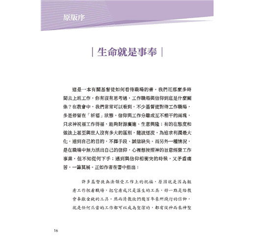「許多基督徒無法領受工作上的祝福,原因就是因為輕看工作輕看職場,把它看成只是謀生的工具,好一點是給教會奉獻金錢的工具。然而清教徒們幾百年來所踐行的信仰,就是任何正當的工作都可以成為聖潔的,都有從神而來神聖的使命,關鍵在於我們的心。所以不在乎你站在哪裡,無論是教會、家庭、職場,只要我們願意邀請神來掌管我們的生命,祂就在我們中間,我們就在服侍神。」