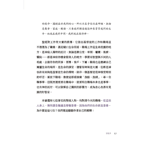 本書選用七位著名的聖經人物,均對照今天的職場。在這些人身上,無所謂全職還是帶職事奉,因為他們的生命就是事奉。為什麼是這七位?我們還是聽聽作者自己的解釋: