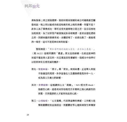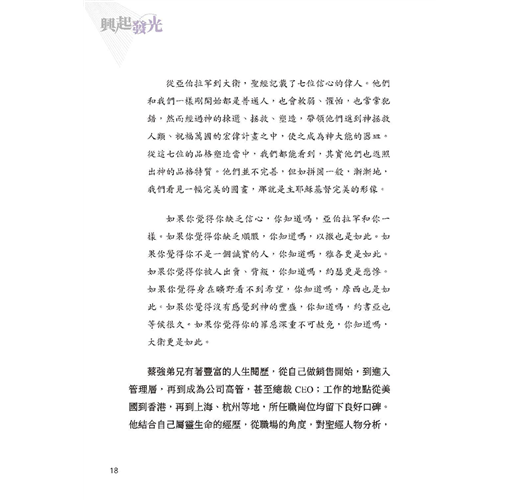 蔡強弟兄通過舊約聖經,從創世記到撒母耳記的七位屬靈偉人所經歷神在他們裡面的奇妙工作,寫出《興起發光》。他們雖然面對黑暗權勢的壓迫,卻因此讓神的榮耀光照顯在他們身上,這是神的揀選和邀請,而不是靠自己的血氣。這些人存著信心得了美好的證據,期待著神為他們準備更美的事。職場是神賜給我們進入祂的榮耀,我們全心、全性、全意、全力去愛祂,邀請祂通過工作洗淨我們的心,與祂(神!)攜著手同行,成就祂的旨意和國度在地上,預備我們作祂的新婦。這是何等的恩召,何等豐盛的榮耀!
