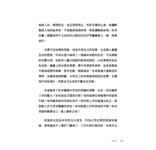 2.很接地氣的三合一見證:自身過去在國內外的職場工作二十多年,同時又蒙召參與教會建造與宣教,特別感受到兩個世界價值觀的差異與衝撞。看過職場的書不少,有些教導雖然也是出於神的話,但是因為缺少職場真實經歷與表達方式,比較理想性,對信徒而言感受比較不接地氣,聽久了不知如何實踐,就容易挫折沮喪。有些職場的見證雖然有力,但是偏向個人主觀經歷,缺少神話語的扎實根基,一般信徒想學卻又做不來,無法建立職場門徒剛強的生命。作者不僅透過聖經真理清楚地闡明神的心意與價值觀,表明作者在聖經真理的用心與追求。同時,也參與跨文化等國際企業的領導工作,在繁忙與壓力下,仍持續追求主,每日讀經靈修,渴慕神的話語與神的帶領。