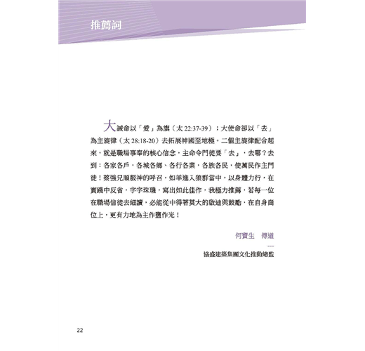 大誡命以「愛」為旗(太22:37-39);大使命卻以「去」為主旋律(太28:18-20)去拓展神國至地極。二個主旋律配合起來,就是職場事奉的核心信念,主命令門徒要「去」,去哪?去到:各家各戶,各城各鄉、各行各業,各族各民,使萬民作主門徒!蔡強兄順服神的呼召,如羊進入狼群當中,以身體力行,在實踐中反省,字字珠璣,寫出如此佳作,我極力推薦,若每一位在職場信徒去細讀,必能從中得著莫大的啟迪與鼓勵,在自身崗位上,更有力地為主作鹽作光!