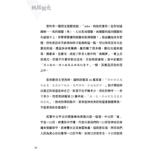 我用了一個假日讀完了《興起發光》這本書,只能說是愛不釋手,蔡強用舊約我們耳熟能詳的七個人物,穿插他個人在職場上的見證,實在是太精彩了,職場上的弟兄姊妹所遭遇的疑難雜症,都可以在本書上得著解答。