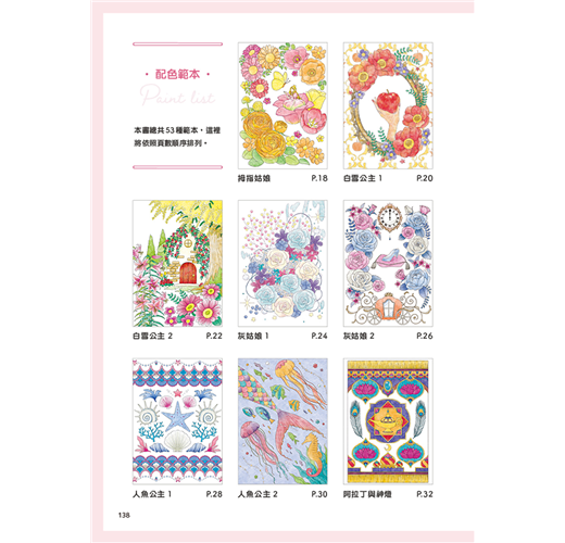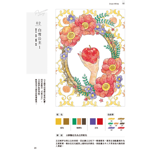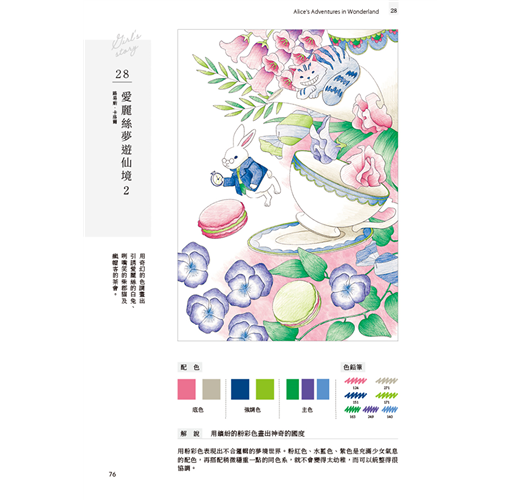 全書收錄53幅著色畫,皆附有全彩的配色範本。