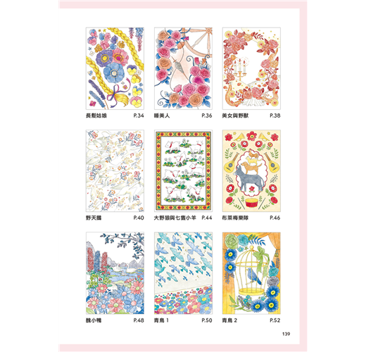共收錄53幅著色畫,都是精緻又漂亮的花朵及動物圖案。