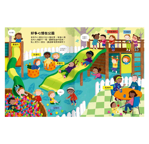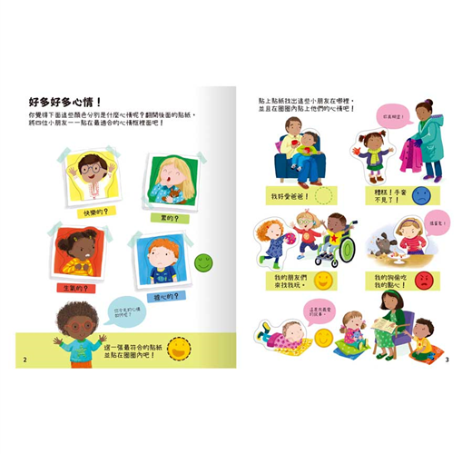 打開書本後方的貼紙貼一貼,認識這些與心情有關的單字,也了解我們百變的心情!