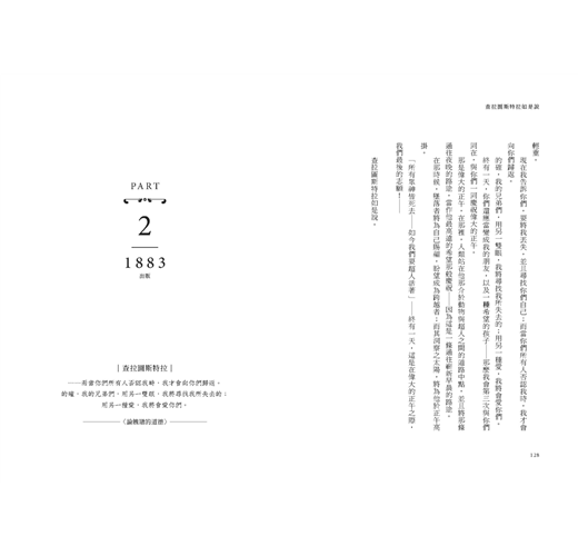 這個時代誕生了如是的巨擘,而在後世造成重大影響與世界的衝突。若要問,哲學與我們有何關聯?那麼便是哲學、政治、美學與人類生活之間千絲萬縷的關聯。而尼采的《查拉圖斯特拉如是說》,便是管窺彼時「(反)時代精神」及其綿延而生的影響的最佳媒介。