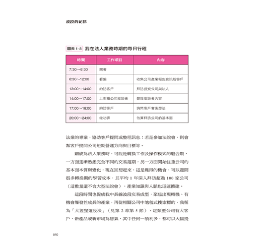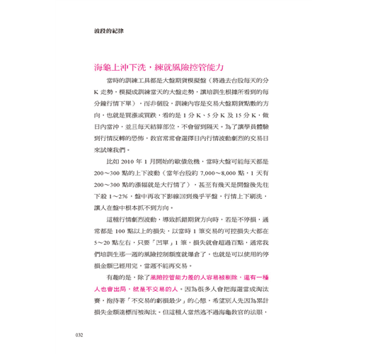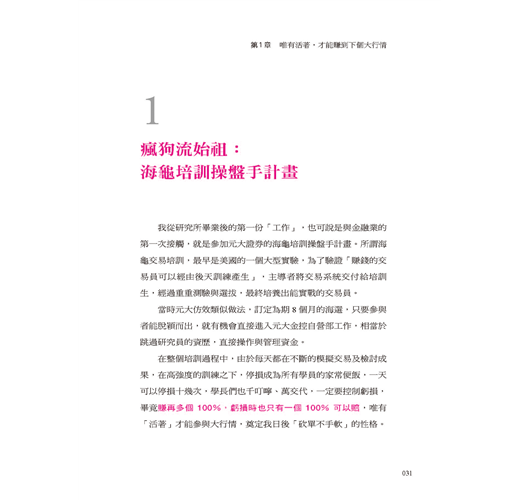 這件事情對於當時初入社會的我來說,其實非常震驚,因為在海龜時期,我們的任何操作都只要對自己的績效負責,從來沒想過,不守紀律的結果,有可能是賠掉一整個部門。紀律問題永遠是投資圈的大忌,只要一次沒處理好,整個投資生涯都可能因此垮掉,不管過去有多麼輝煌的紀錄都沒用,在我往後的投資中,也會時不時拿這段經驗來管理下屬,和警惕自己。(節錄自第1章第2節)