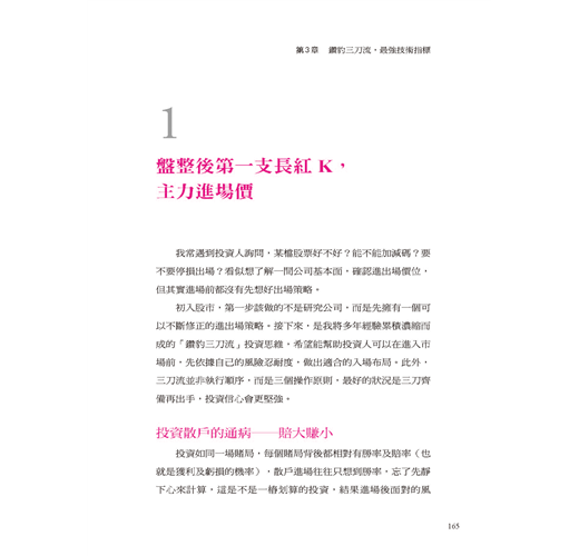 現在回憶起這段時光仍舊很懷念,儘管沒有薪水,壓力也很大,但能按照自己的進出場準則,有紀律的操作,最終賺取獲利的成就感,實在是珍貴的體驗。最重要的是,停損的原則深深刻印到我的骨髓裡,可說是我在投資這件事上學會的第一堂課,讓我往後在金融市場少走很多彎路,懂得在不利的情況下盡可能減少損失。(節錄自第1章第1節)