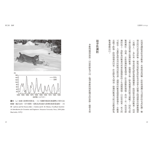 不過,要判定是掠食者在控制獵物數量,抑或受到其他因素控制的獵物數量,反過來調節著掠食者數量,其實相當困難。從哈德遜灣公司提供的毛皮紀錄,整理出的代表性資料集,展現出雪鞋兔和掠食者加拿大猞猁之間週期性的變動關係(見圖6)。多年來,學者都認為野兔受到猞猁獵食,能抑制其過多的數量,而這又會反過來減少猞猁的數量。猞猁變少後,野兔遭到獵食的壓力減輕了,因此又能繁殖興旺。再進一步使猞猁的數量增加,於是啟動新循環。然而,在一些沒有猞猁的島上,雪鞋兔的數量仍然會依循類似的十年週期循環。目前看起來,更大的可能是,大量野兔將食用的植物消耗殆盡,週期性的數量崩潰就會發生。在數量直線下跌後,植物慢慢長回來,於是野兔又增加。猞猁的數量可能只是跟著野兔數量變動而已。