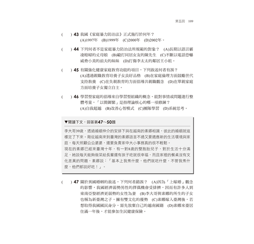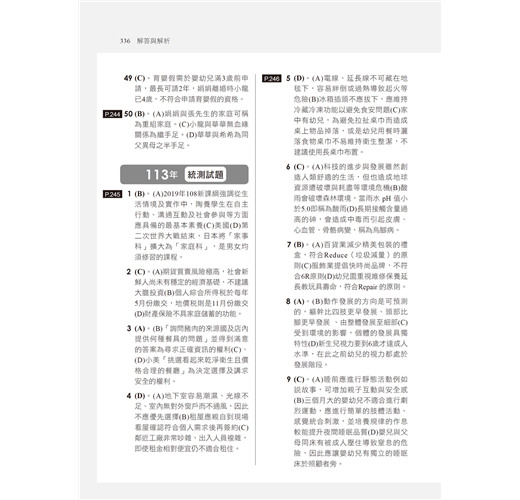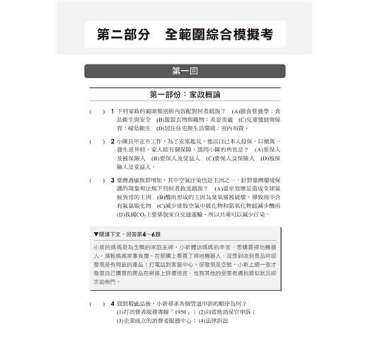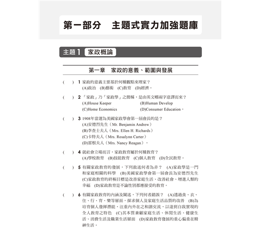 依據新課綱家政概論、家庭教育課本內容中的章節作為劃分,精選各主題及章節中常見的考題,考生可以在研讀一個章節後,以第一部分進行小範圍的試題練習,檢核短期的學習成果,並精熟各章節常考的內容。