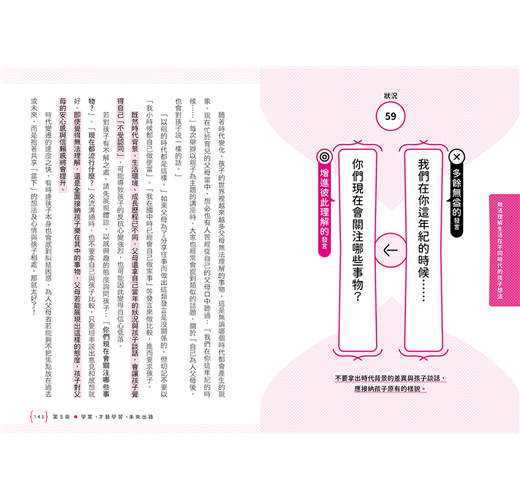 透過大量的對話實例,幫助家長練習將親子關係造成不良影響的「多餘無益的發言」,換成加深信賴關係的「增進彼此理解的發言」。