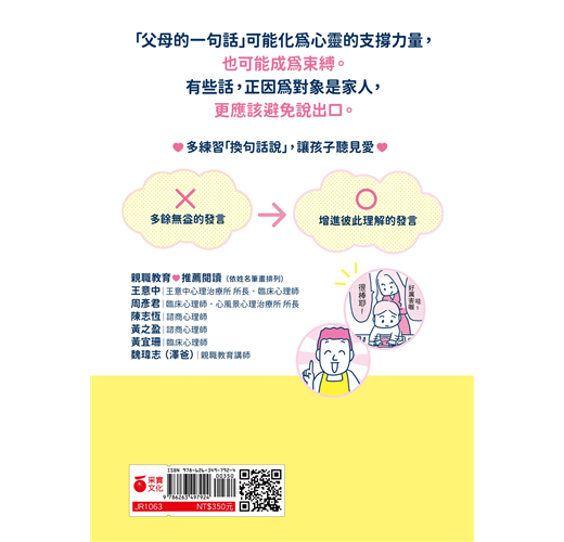 「我們跟孩子所說的話,就是他的母語!」閱讀這本書後,我自已也獲得了許多替代童年傷痛話語的療癒解方,期待你也收穫甚豐!──黃之盈|諮商心理師.暢銷作家