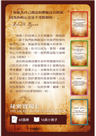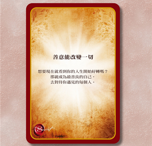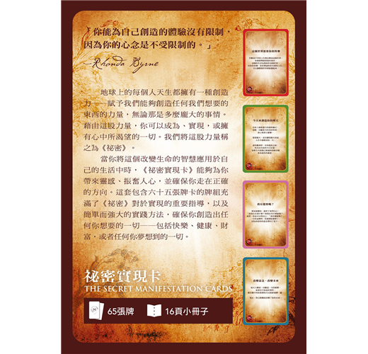 《祕密實現卡》就是為了要讓你能持續應用這項知識來改變人生而設計的。這套牌共65張,寫滿了《祕密》裡關於實現心願最關鍵的重點,以及簡單又強效的實踐方法,保證你能創造出你在人生中想完成的、想擁有的一切。