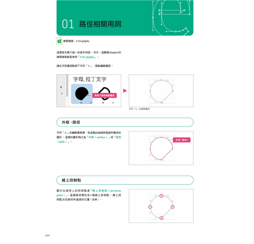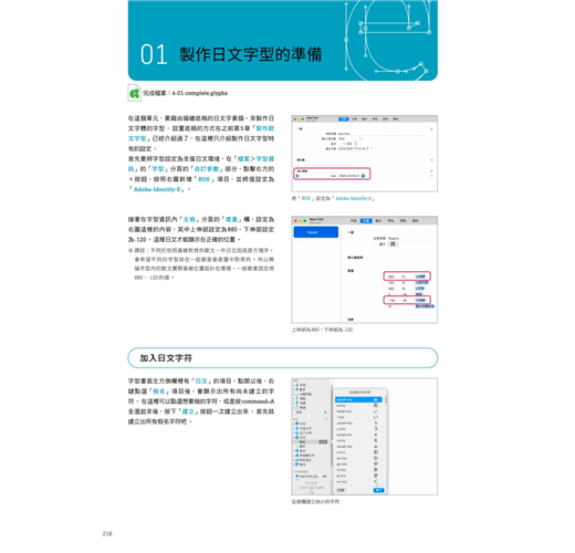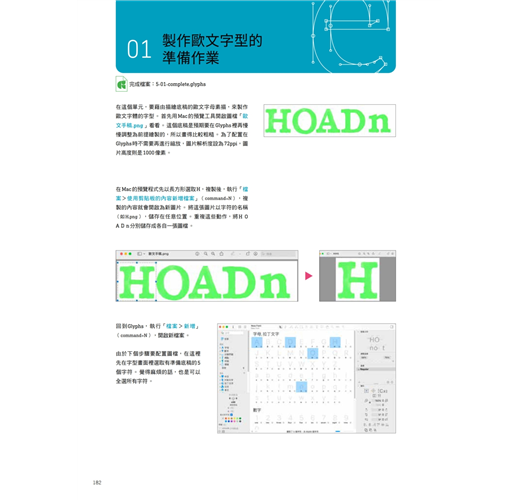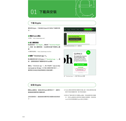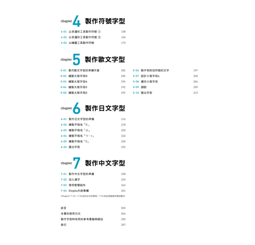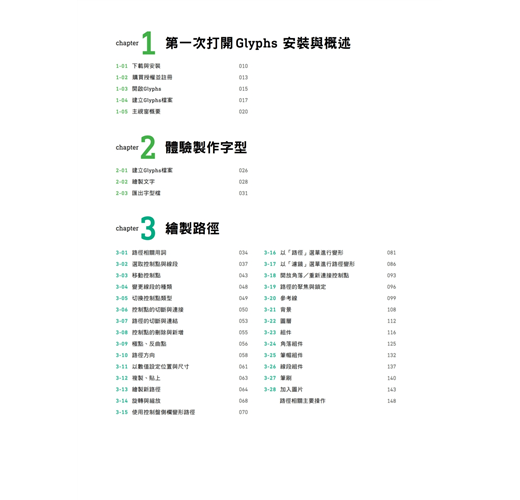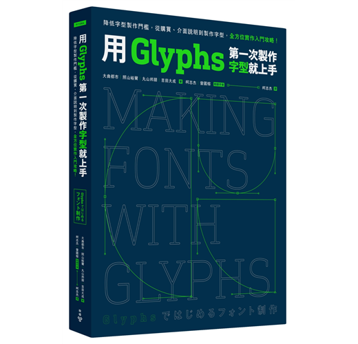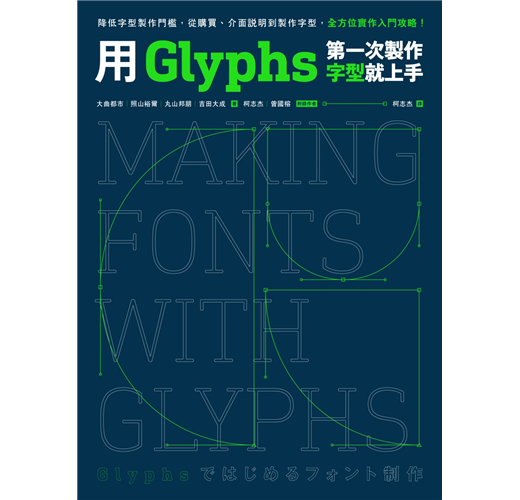 這套軟體目前已推出第三版,本書為針對第3版所撰寫的操作手冊。前6章,由日本四位長年在字型製作領域耕耘,並實際運用Glyphs製作字型的設計師:大曲都市、照山裕爾、丸山邦朋、吉田大成,以圖文並陳的方式,一步步從入門階段帶領讀者從購買、安裝到繪製路徑的步驟與方法。針對已經知道軟體如何操作的讀者,則建議讀者從第4章製作圖案字型、歐文字型、日文字型開始閱讀。