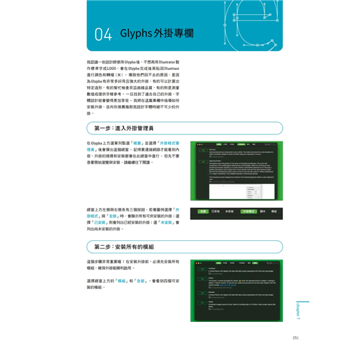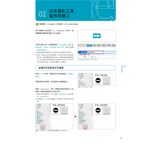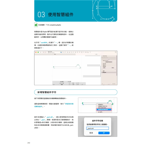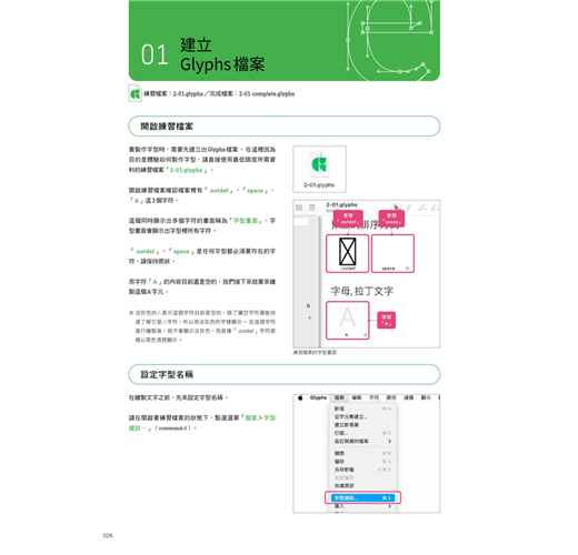 為使讀者能夠學習本書示範功能,各章節皆有準備「作業檔案」,讓讀者更能透過實作掌握軟體操作技巧。繁中版也新增由「字嗨」社團發起人柯志杰撰寫的「如何透過Glyphs製作中文字型」,以及justfont設計師曾國榕所整理的「Glyphs外掛專欄」單元,提供台灣字型設計學生與專業人士進一步理解使用Glyphs製作中文字型的基礎概念。