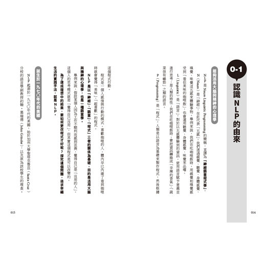 N(Neuro)是「神經」,在此代表「五感」,我們透過視覺、聽覺、身體感覺、嗅覺、味覺這五感來體驗事物;L(Linguistic)是「語言」,對於以五感體驗到的資訊,使用語言賦予意義並加以思考,是人類的特性;P(Programming)是「程式」,人類以語言為基礎製作程式,然後根據這個程式行動。NLP就是以「神經」、「語言」、「程式」三者為基礎,活用大腦與精神的心理學。