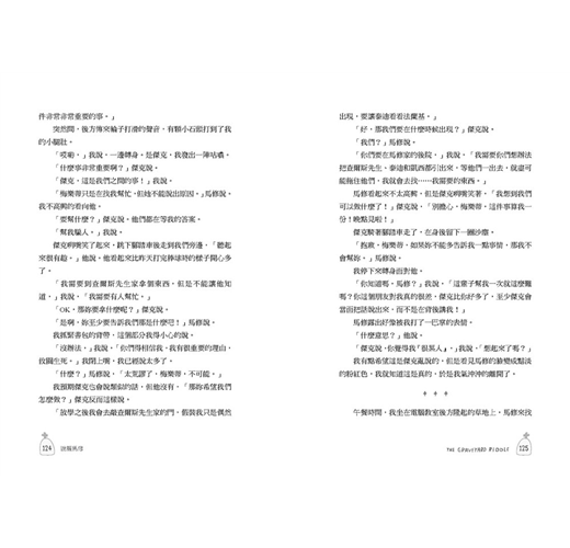 從小路走回栗樹巷時,我還在想這件事。老妮娜在前院裡,正伸出手試著撿一個被風吹到家門附近、灌木叢下方的零食包裝袋。她養的虎斑貓「胡椒」坐在門階上,在陽光下眨著眼。老妮娜去年夏天養了胡椒這隻小貓,牠非常膽小害羞,就跟牠的主人一樣。那隻貓看了我跟法蘭基一眼後便衝回屋裡。
