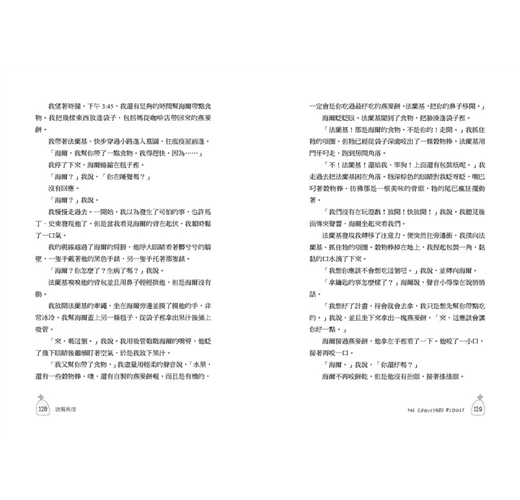 我們經過那棵周圍被長凳以六角形圍繞的七葉樹,還有讓訪客用灑水壺取水的生鏽水龍頭。我們通常會走主要步道往教堂前進,再繞一圈回來。但是當我們經過水龍頭的時候,我看見一條我們很久沒有走的小徑,那裡長滿了常春藤和荊棘,通往墓園最老舊的地方。現在已經沒有人會去那裡追憶親人了,因為他們自己都過世下葬了。