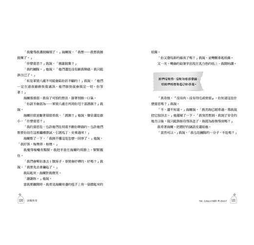 不知道她是怎麼做到的,老妮娜總是能讓簡單的句子聽起來有很深的意義。當她微笑的時候,我發現她的臉頰上有交織的紅色小細紋。媽說她覺得老妮娜應該快一百歲了,但是沒有人知道她到底幾歲。老妮娜的家被稱作「牧師宅」,在這條死巷盡頭的正中央,就在通往墓園的小路旁邊。這棟房子已經存在好久好久了,遠比我們單調的米色房子還要久。我很好奇老妮娜知不知道那間奇怪的小屋。