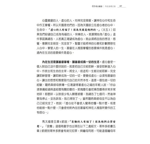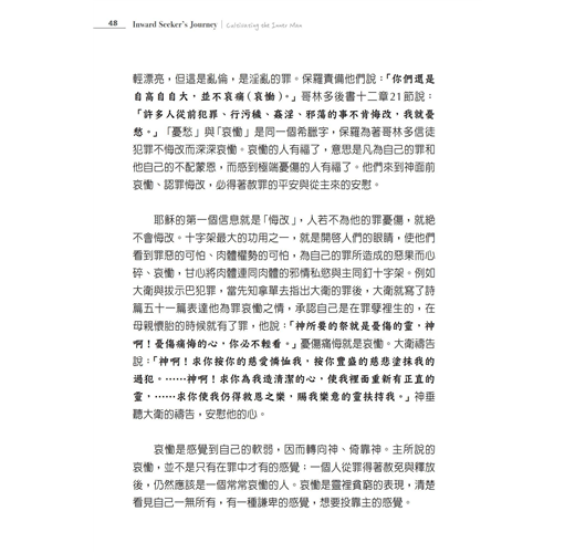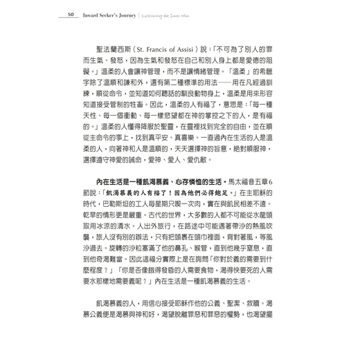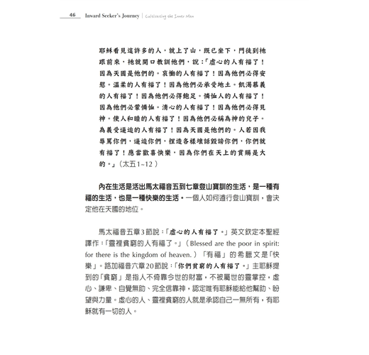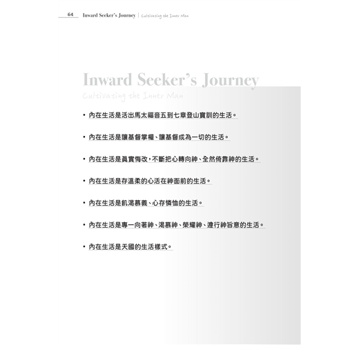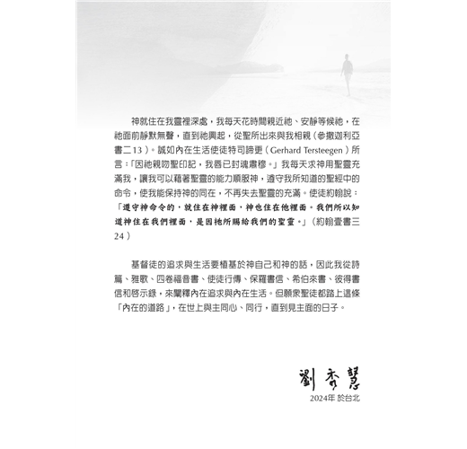 基督徒的追求與生活要植基於神自己和神的話,因此我從詩篇、雅歌、四卷福音書、使徒行傳、保羅書信、希伯來書、彼得書信和啟示錄,來闡釋內在追求與內在生活。但願眾聖徒都踏上這條「內在的道路」,在世上與主同心、同行,直到見主面的日子。