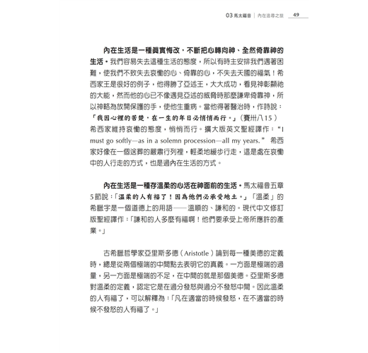當我們向外探索之前,必須有深耕內在的能力。基督徒所追求的乃是神自己,並要將屬靈生命建造在神話語的根基上,本書從詩篇、雅歌、四卷福音書、使徒行傳、保羅書信、希伯來書、彼得書信和啟示錄,來闡釋內在追求與內在生活。