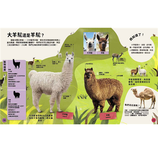 駱駝的兩位表親——大羊駝和羊駝,生活在南美洲安第斯山脈的高處。兩者都飼養在農場中,牠們的毛可以製成毛線,再製成衣服和毯子。小心啊,他們生氣的時候可是會吐口水的呢!
