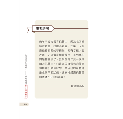 在這本書中,倪伯時院長不僅分享了他對疾病根源的深刻見解,還提供了關於如何透過平衡生活方式、飲食調整和心態轉變來預防疾病的實用策略。他堅信,真正的健康不僅僅是沒有疾病,而是身心靈的全面和諧與平衡。