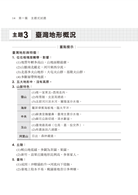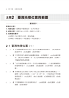 1臺灣自然:位置與範圍、地形、海岸與島嶼、氣候與河系、環境資源與保育。