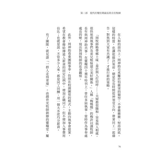 此外,周神助看重團隊事奉,仿照在校園團契的模式,主動向執事會提案,希望在教會撥給傳道人薪資的固定比例中,增加正職同工、但不增加人事費用佔比;也就是說,不管多少人來,都是同工同酬、用一個大水池均分薪資。