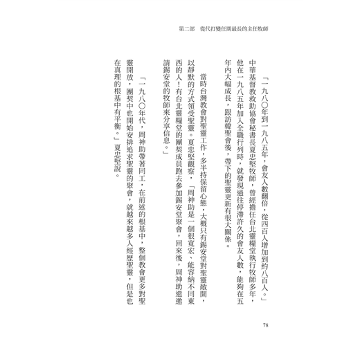 「一九八〇年代,周神助帶著同工,在前述的根基中,整個教會更多對聖靈開放,團契中也開始安排追求聖靈的聚會,就越來越多人經歷聖靈,但是也在真理的根基中有平衡。」夏忠堅說。